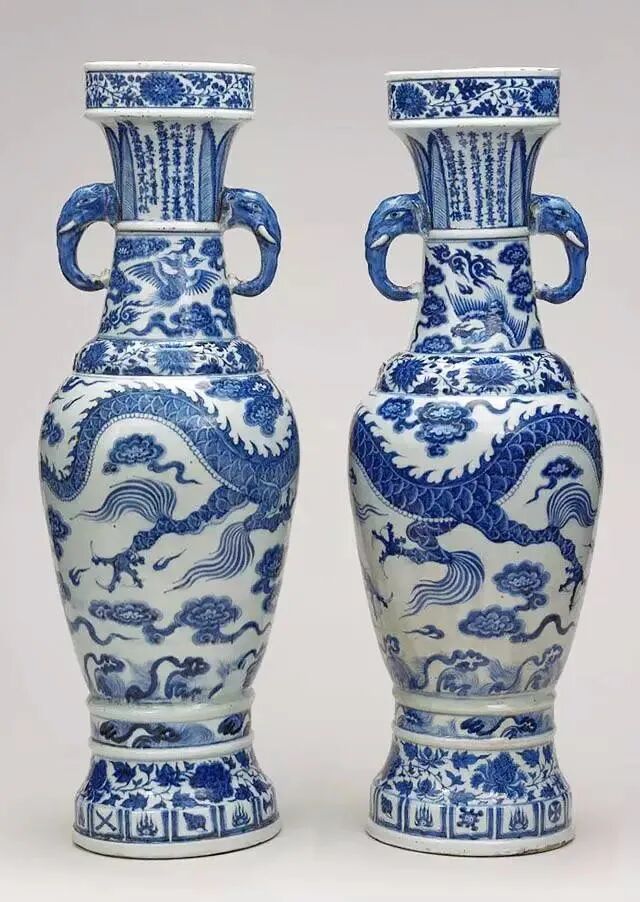 这对青花云龙象耳瓶又叫大维德瓶、青花象耳瓶或叫至正青花瓶,这两只大维德瓶均有伤残且器形歪斜,一只高63.3厘米,直径21厘米;另一只高63.6厘米,宽22厘米,形体硕大,有八层纹饰,顺序为缠枝扁菊、蕉叶、飞凤灵芝、缠枝莲、四爪云龙、海涛、缠枝牡丹和覆莲杂宝。杂宝有银锭、法螺、笏板、双角等吉祥物。器上有铭文:“信州路玉山县顺城乡德教里荆塘社,奉圣弟子张文进,喜舍香炉花瓶一副,祈保合家清吉,子女平安。至正十一年四月良辰谨记。星源祖殿,胡净一元帅打供”,这些铭文成为鉴证大瓶年代最有力的证据。此瓶原藏于伦敦大学伦敦大维德基金会,2007年由于运营成本压力转移至大英博物馆,从2009年大英博物馆95号“中国陶瓷”展厅开放,开启了大维德基金会藏中国艺术品在大英博物馆的“长期借展”之旅。这对大瓶器型复杂,造型挺拔俊秀,画工精湛流畅,有确切纪年,为现存最重要的青花瓷样品之一,是世界上唯一以姓氏命名的中国瓷器,也是中国陶瓷史上非常重要的里程碑,是鉴定元青花的标准器。