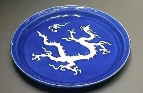 元蓝釉白龙戏珠纹盘(元蓝釉金彩瓷器代表作)