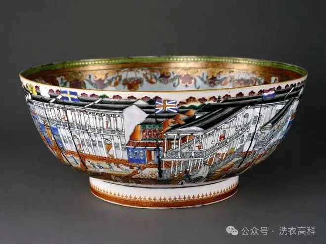此碗上的图案为广州城墙和珠江岸间一带建造的外国商馆。虽然每栋建筑前面的空地很窄,但是商馆占地可延伸至300 米。