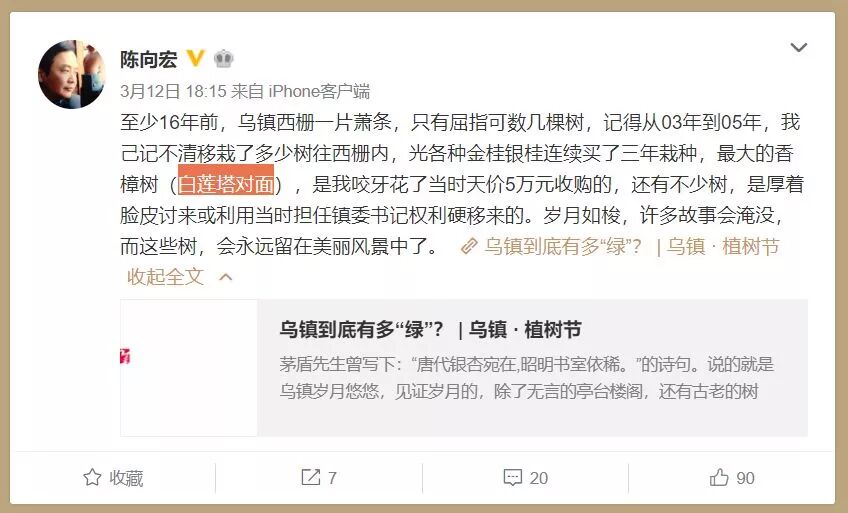 为了让原本萧条的乌镇西栅变得有活力,陈向宏在03年到05年不停地移栽树木到西栅,他自己也记不清到底栽了多少树。