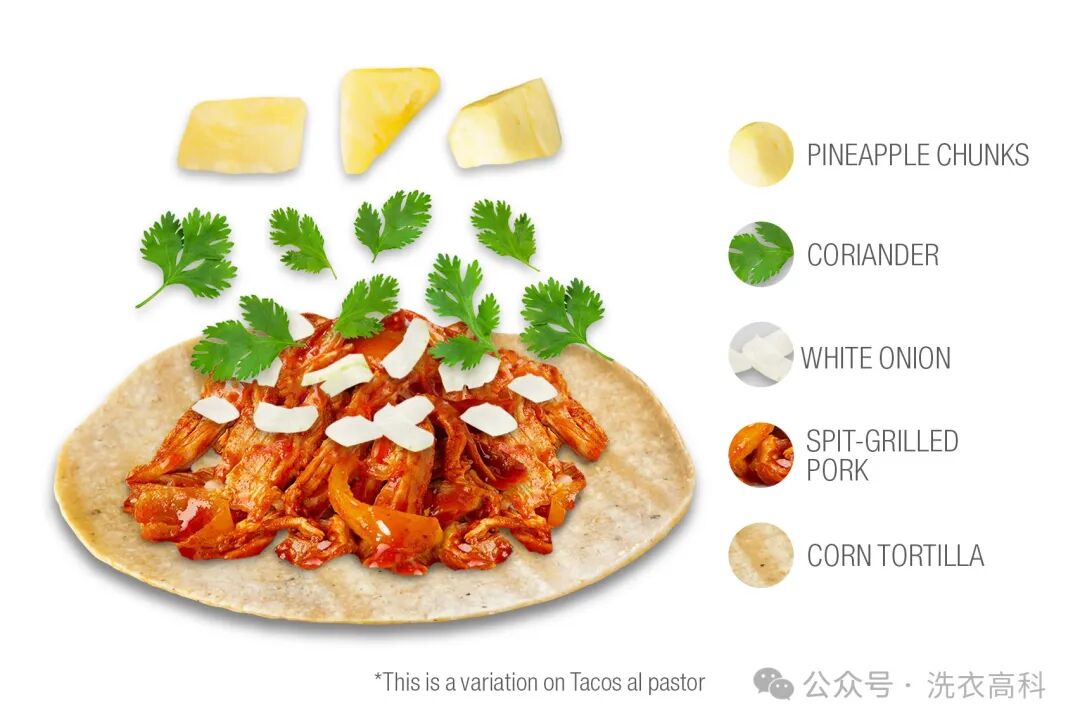 它源于流行的沙瓦玛,但墨西哥人改变了香料,并用猪肉代替了羊肉。Tacos al pastor 起源于普埃布拉市,其名称被翻译为牧羊人式玉米饼。不过,在这道菜中加入菠萝仍然是一个待解之谜。