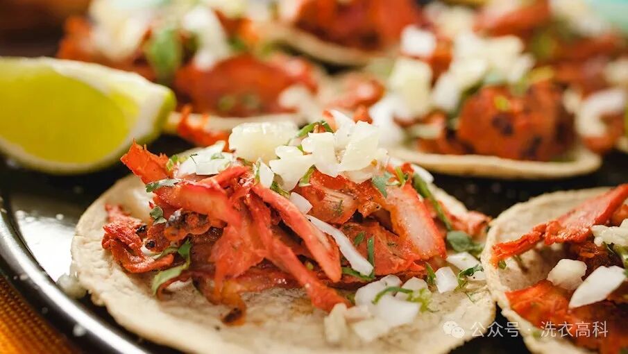 Tacos al pastor 是一道墨西哥菜,由从旋转烤架上刨下来的猪肉薄片组成,放在玉米饼上,浇上洋葱、切碎的香菜、菠萝块、辣椒和辣酱。这道菜是由黎巴嫩的烹饪传统演变而来的,黎巴嫩人在 19 世纪末与众多移民一起来到墨西哥。