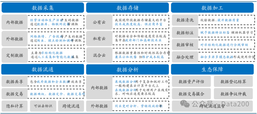 数据存储:数据存储是数据要素产业链的第二环节,是指将数据进行存储,以便后续使用。数据存储包括公有云存储、私有云存储和混合云存储。公有云存储是指将数据存储在公有云平台上,具有成本低、灵活性高等优点。私有云存储是指将数据存储在企业自建的私有云平台上,具有安全性高、可控性强等优点。混合云存储是指将数据存储在公有云平台和私有云平台上,具有公有云和私有云的优势。