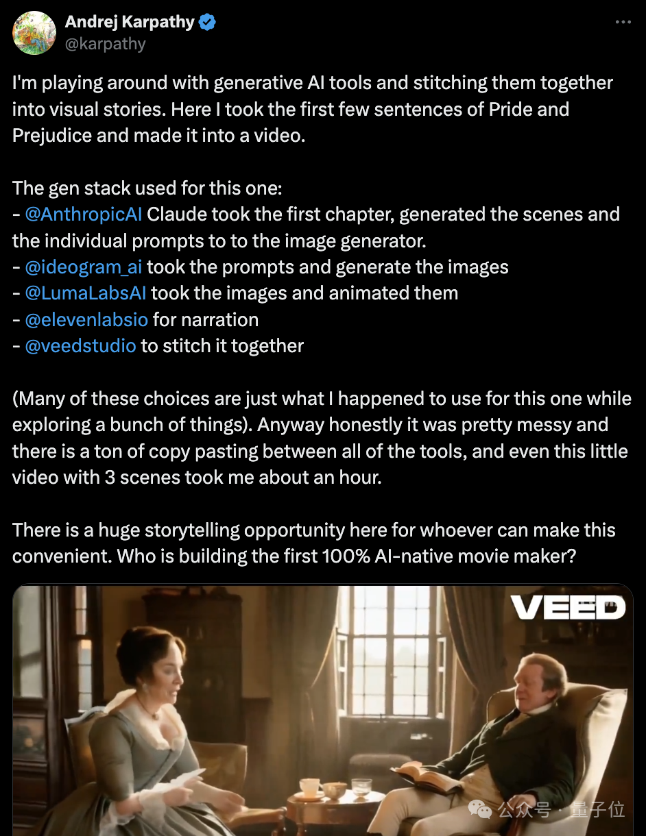 举个例子,OpenAI创始成员Andrej Karpathy最近也玩上了AI视频,整出了个AI版《傲慢与偏见》。