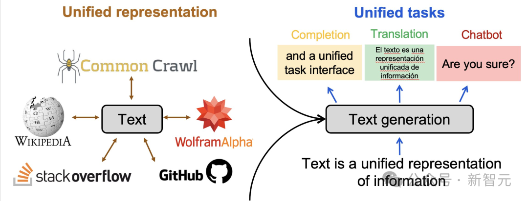 为了得出这一观点,我们首先确定了使语言模型能够解决许多现实世界任务的关键组成部分:(1) 能够从互联网吸收广泛信息的统一表示法(即文本)、