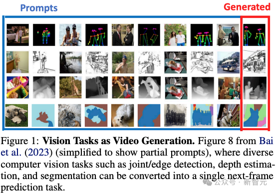 最近的研究表明,可以将不同的视觉任务转换成上图所示的视频生成任务,而且这种解决视觉任务的统一方法可以随着模型大小、数据大小和上下文长度的增加而扩展。