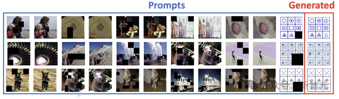 同样,以视频作为统一的表示和任务界面,视频生成也通过预测图像的遮蔽区域显示出视觉推理的早期迹象,如上图所示。