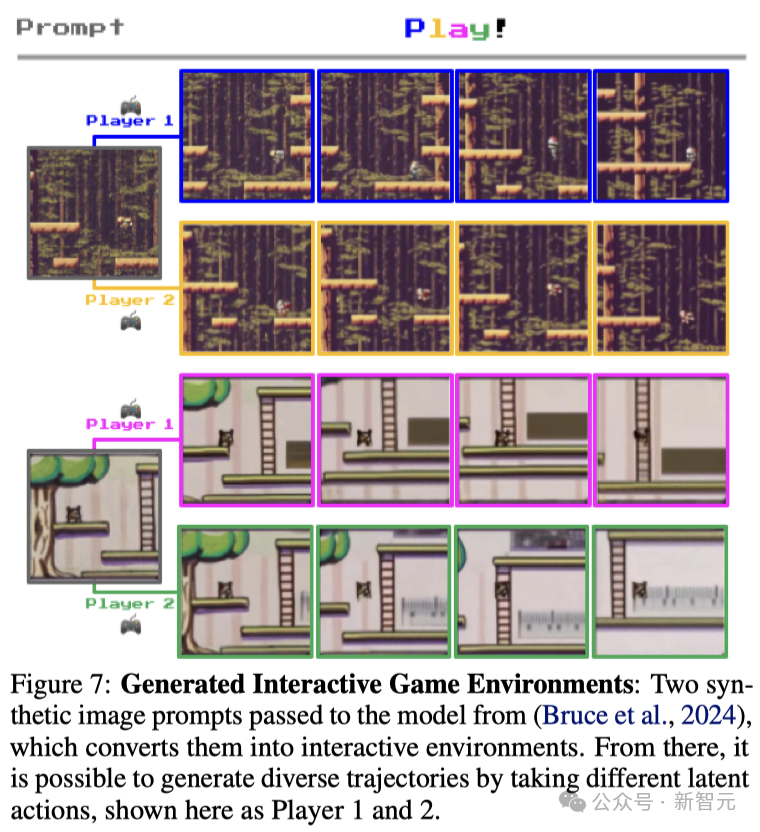 如图7所示,通过学习大规模互联网上未经标注的游戏数据中的潜动作,然后训练一个可控制动作的视频模型,可以实现从一张提示图像生成无限可能的多样化互动环境。