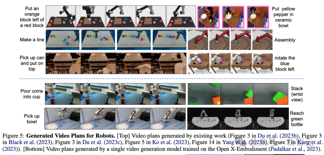 在上图中提供了在 Open X-Embodiment 数据集 之前和新生成的视频计划看起来都非常逼真,并成功完成了指定任务。