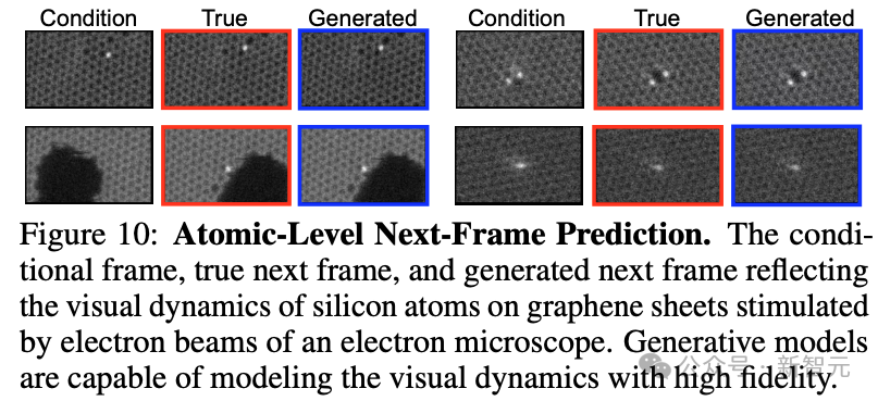 下图展示了硅原子在碳原子单层上,在电子束的刺激下的动态变化。可以看到,这种生成式模拟器能够准确地在像素层面捕捉硅原子的移动。