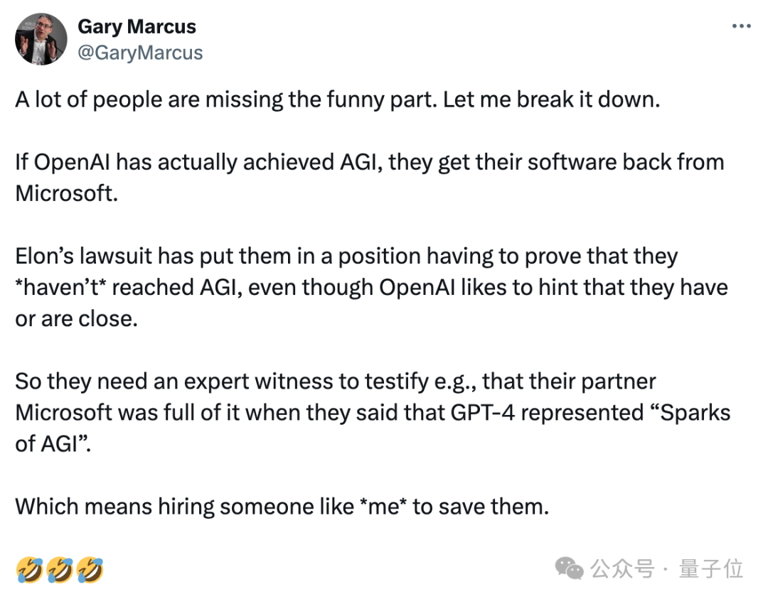 马库斯则调侃说,马斯克这么做逼得OpenAI不得不承认自己没达到AGI,但是可以找第三方来承认。