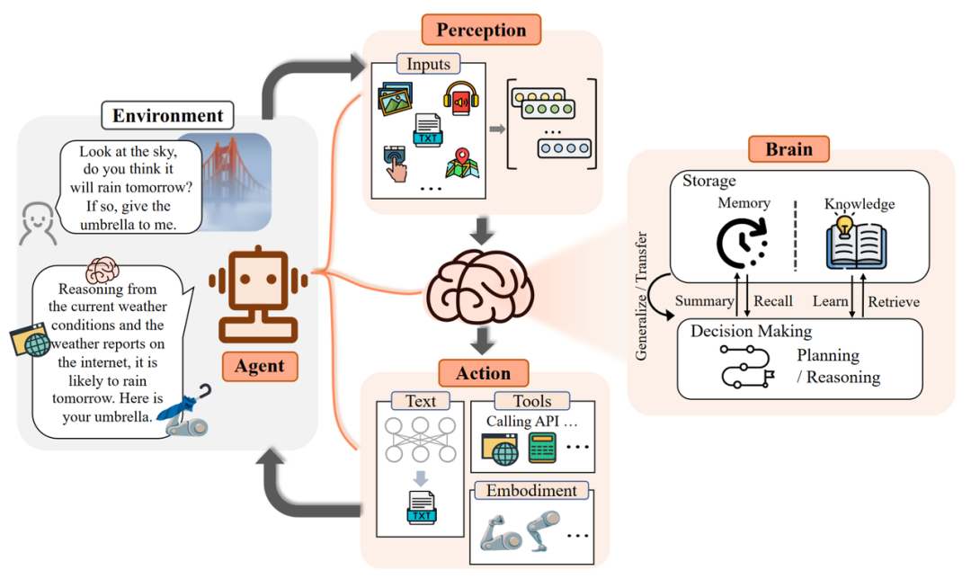 作者们用一个例子来说明来了 LLM-based Agent 的工作流程:当人类询问是否会下雨时,感知端(Perception)将指令转换为 LLMs 可以理解的表示。然后控制端(Brain)开始根据当前天气和互联网上的天气预报进行推理和行动规划。最后,行动端(Action)做出响应并将雨伞递给人类。