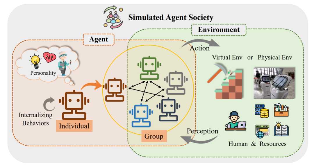 右侧部分:环境的形式可以是虚拟的沙盒环境,也可以是真实的物理世界。环境中的要素包括了人类参与者和各类可用资源。对于单个代理而言,其他代理也属于环境的一部分。