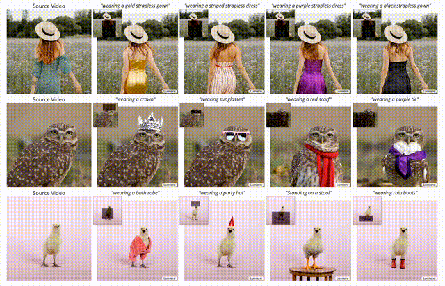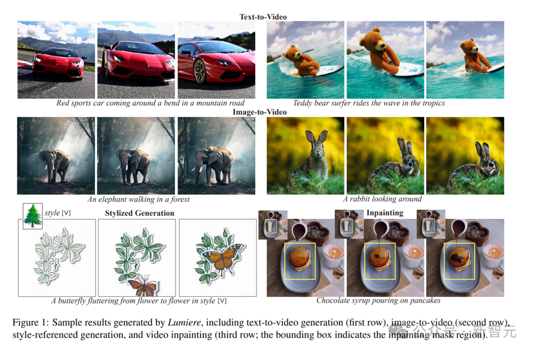 Lumiere生成的示例结果,包括文本到视频生成(第一行)、图像到视频(第二行)、风格引用生成和视频修复(第三行边界框表示修复掩码区域)