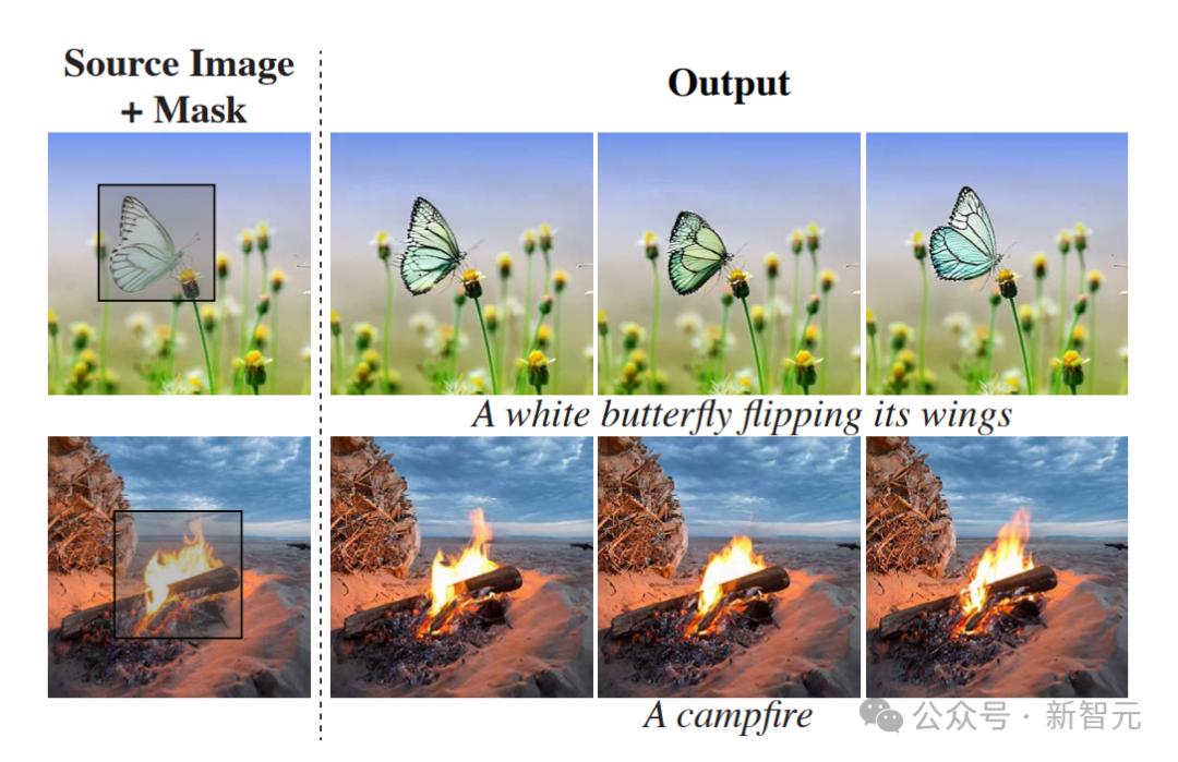 仅给定输入图像和掩码(左),研究者的方法会生成一个视频,其中标记区域是动态的,其余部分保持静态(右)。