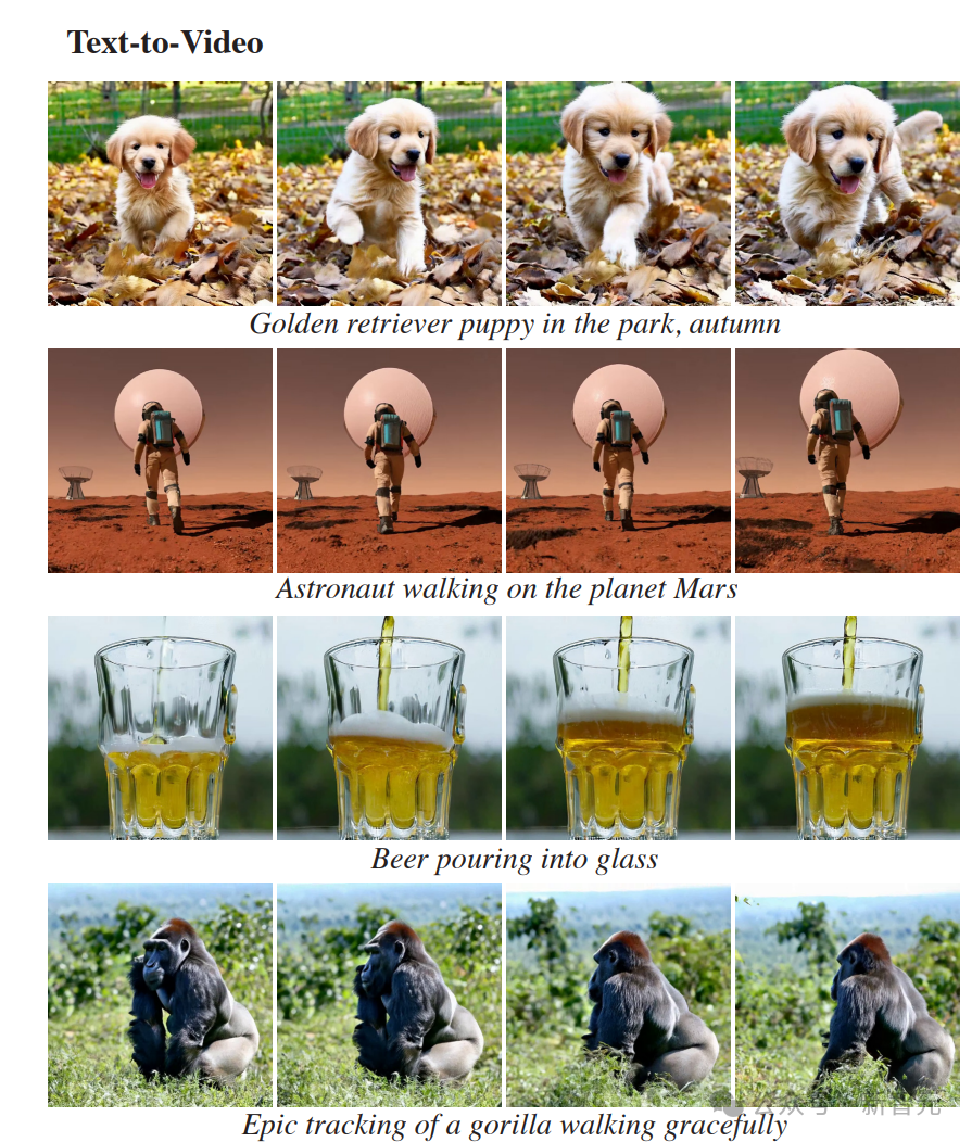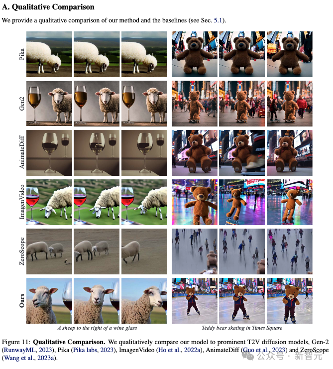 请注意,ZeroScope和AnimateDiff分别仅生成3.6秒和2秒的视频,因此在与它们进行比较时,研究人员会修剪视频以匹配其持续时间。