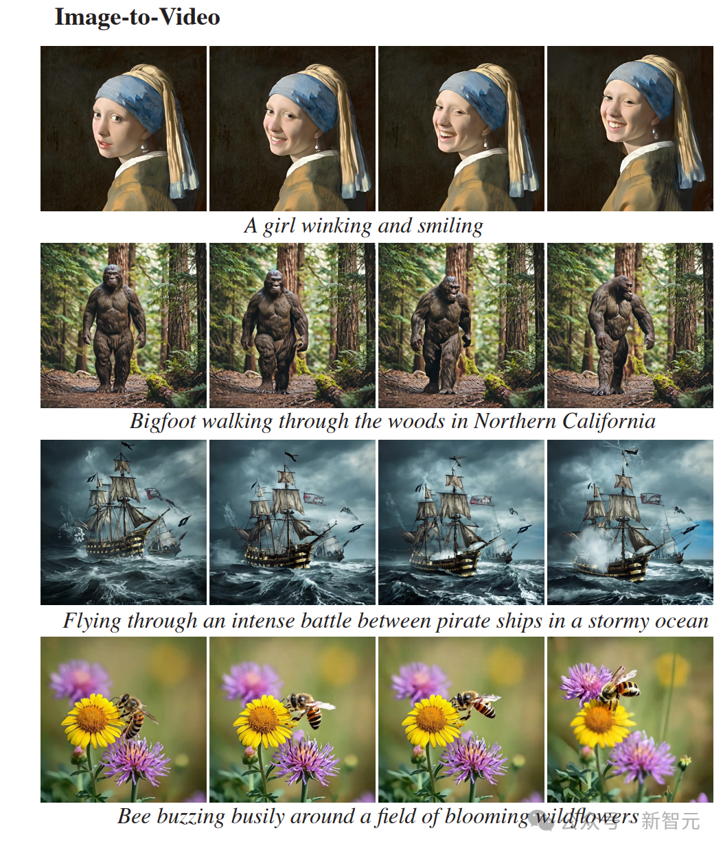 从图像到视频的示例中,最左边的帧是作为条件提供给模型的。