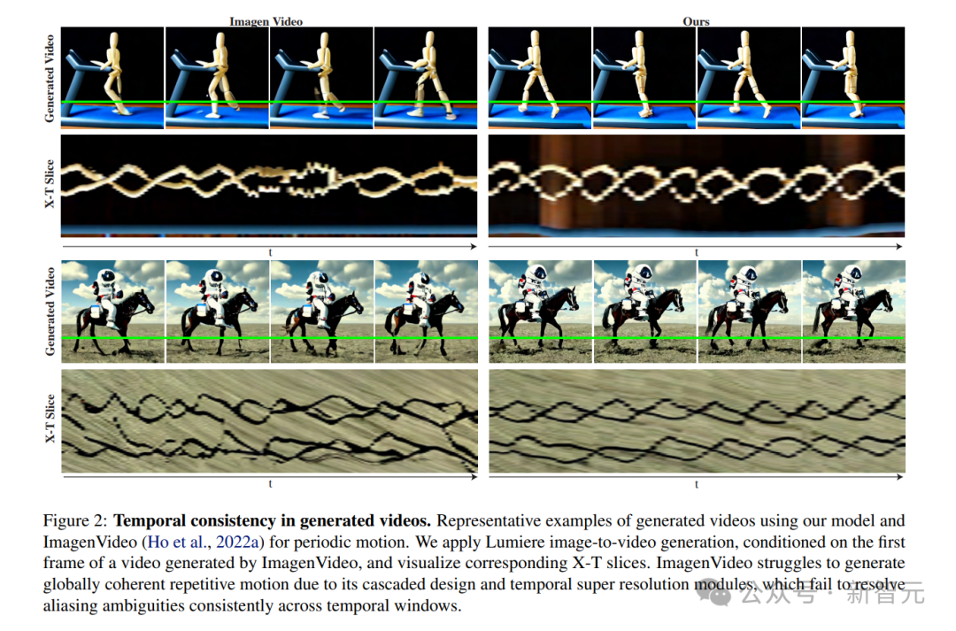 使用Lumiere和ImagenVideo进行周期性运动生成视频的代表性示例。研究者应用 Lumiere图像到视频生成,以ImagenVideo生成的视频的第一帧为条件,可视化相应的X-T切片。由于其级联设计和时间超分辨率模块,Imagenvideo难以生成全局连贯的重复运动,而这些模块无法跨时间窗口,一致地解决混叠模糊问题