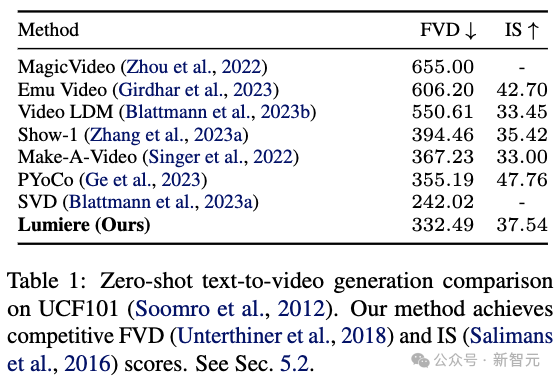 研究人员在UCF101上定量评估了他们的零样本文本到视频生成方法。