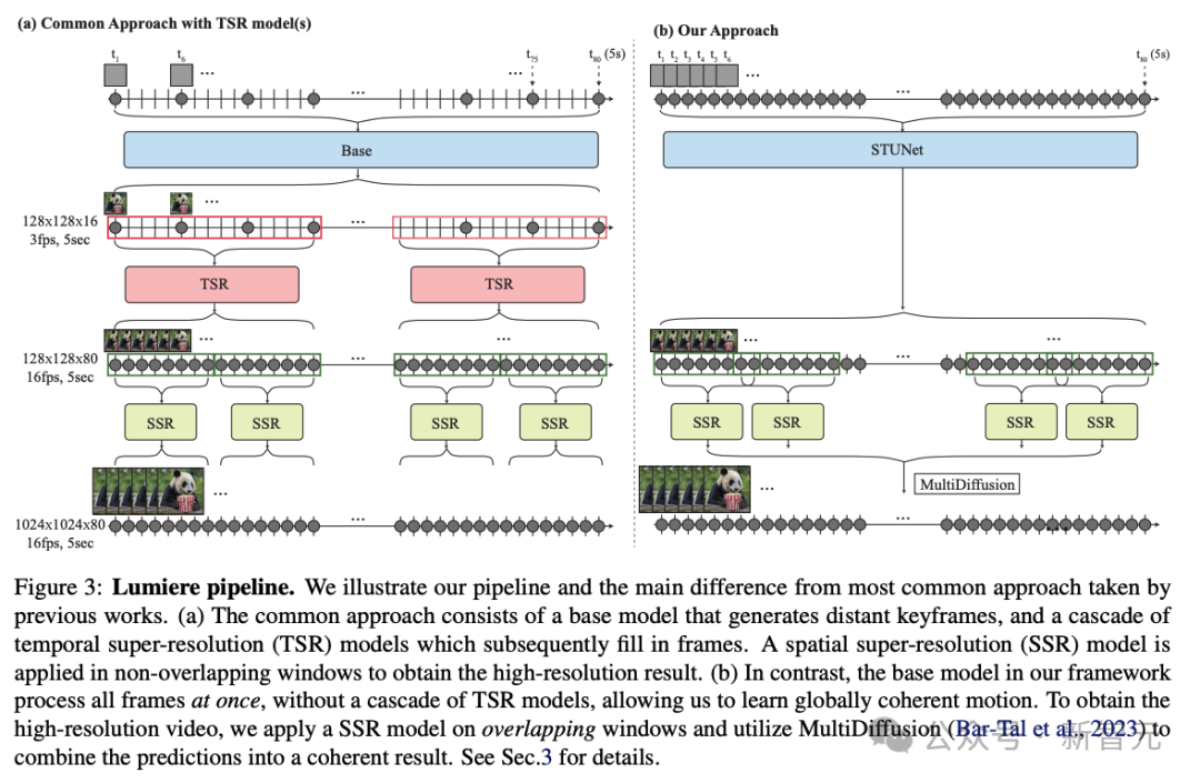 Lumiere基本模型可以生成全帧率视频,无需TSR级联,从而为下游应用程序提供更直观的界面。