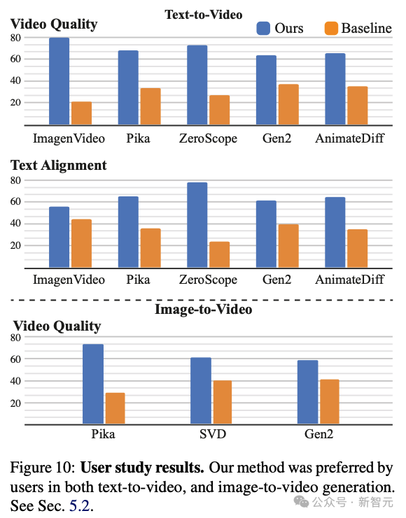 请注意,SVD图像到视频模型不以文本为条件,因此研究人员将调查重点放在视频质量上。如上图所示,与基线相比,研究人员的方法更受用户青睐。