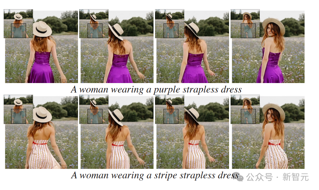 比如这个穿绿底白花裙的女孩,只要选中衣服区域,输入文字修改要求,就能瞬间把她的裙子改成红白条纹裙、金色抹胸裙。