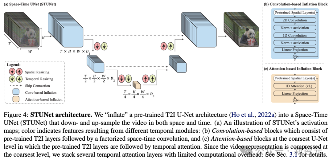 他们在T2I架构中交织时间块,并在每个预训练的空间调整大小模块之后插入时间下采样和上采样模块(图4a)。时间块包括时间卷积(图4b)和时间注意力(图4c)。