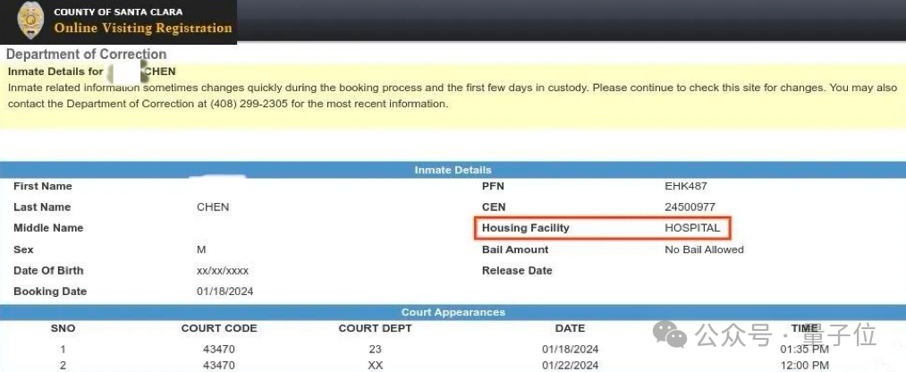 查询美国圣克拉拉法院官网公开信息,目前,涉事男方Liren Chen并未死亡,其状态是“在医院”,且不允许保释。