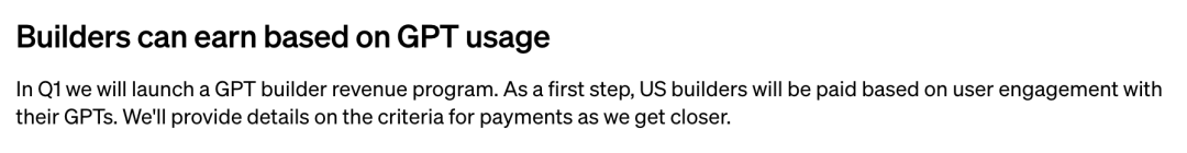 OpenAI表示,「今年第一季度我们将推出GPT创建者收入计划。作为第一步,美国的创建者将根据用户对其GPT的参与度获得报酬。我们会提供有关支付标准的详细信息」。