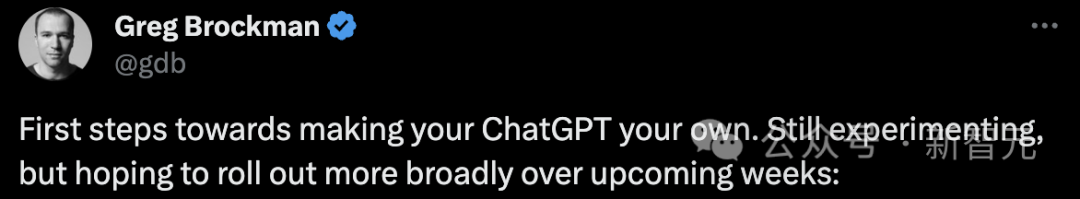OpenAI联创Greg Brockman表示,这只是构建个性化ChatGPT的第一步,目前还是测试中,未来几周会上线。