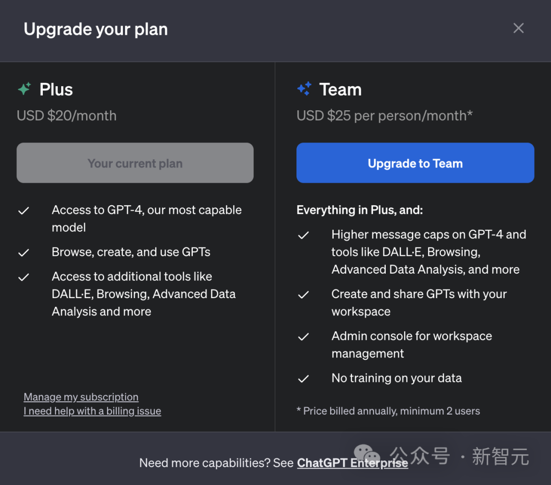 值得一提的是,ChatGPT Team的费用为每位用户每月25美元(年付制),或每位用户每月30美元(月付制)。