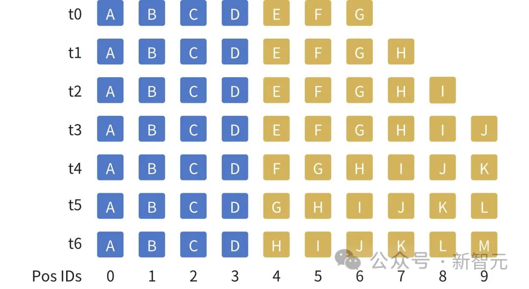 如下图所示,假设窗口大小为10个token,随着生成的token增加(由黄色方块表示),我们在KV缓存中将中间的token踢出,与此同时,始终保持着文本开始的几个token(由蓝色方块表示)。由于黄色方块的位置会发生变化,在计算注意力时,我们也需要重新注入位置信息。