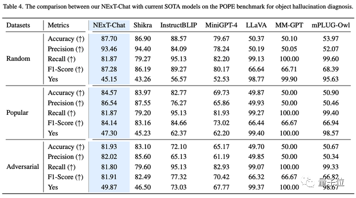 在图像幻觉任务上,如表3所示,NExT-Chat可以在Random和Popular数据集上取得最优的准确率。