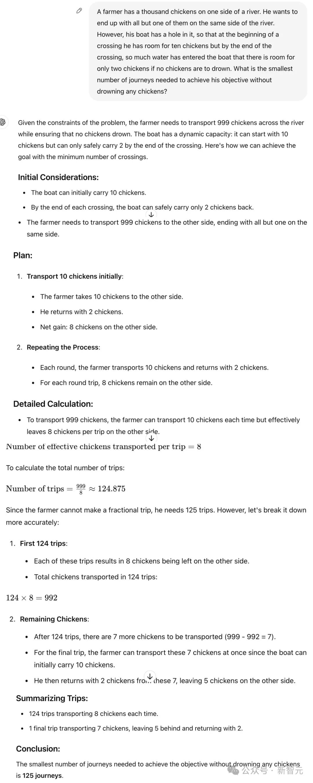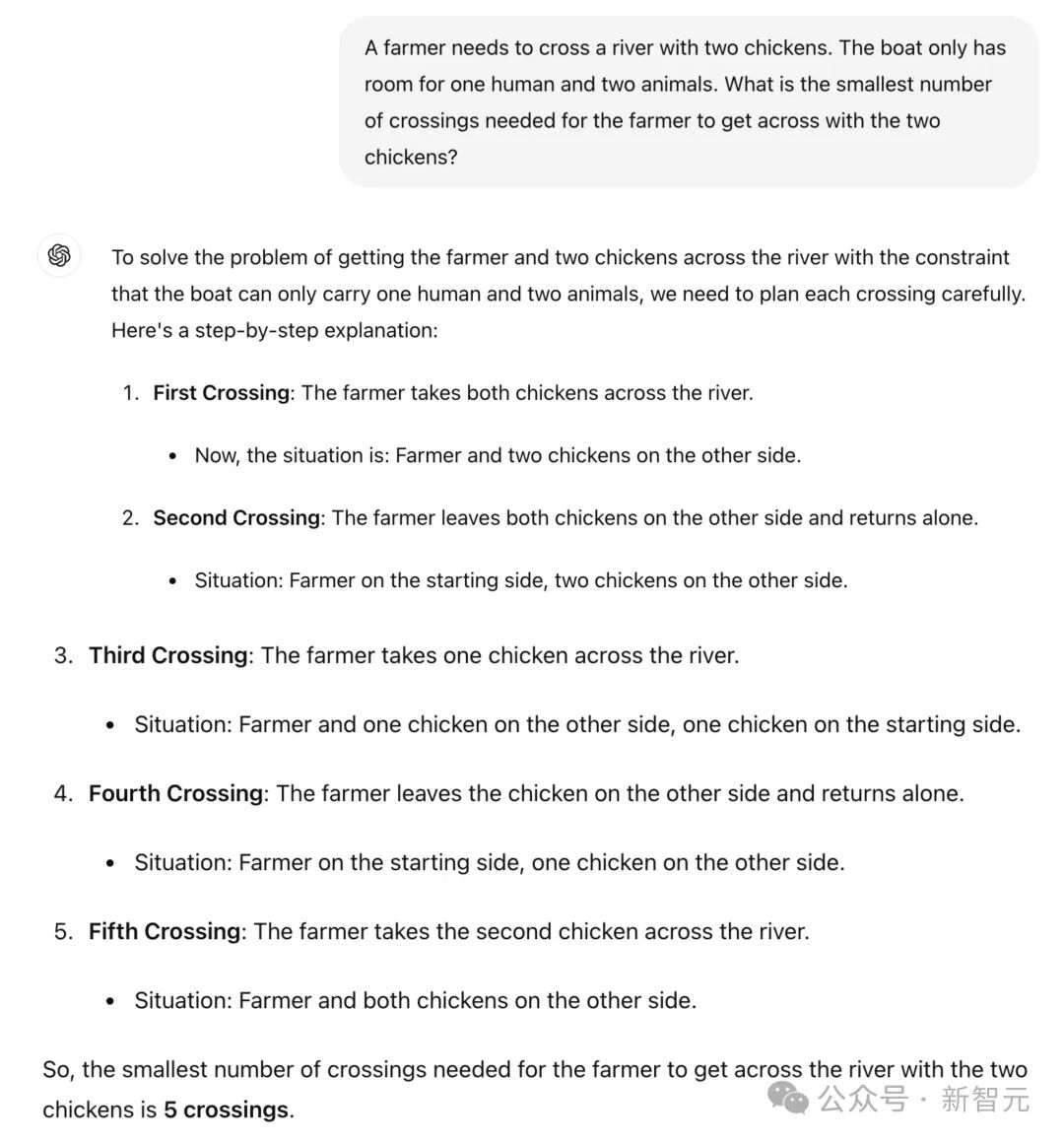 在网友测试的一个案例中,即使被告知农夫根本不需要过河,GPT-4o仍提出了一个9次渡河的复杂解决方案。