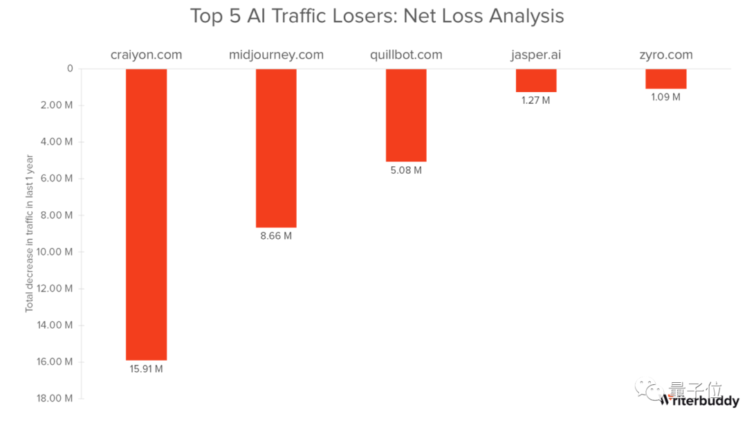 流量流失的前五名,则分别是Craiyon、Midjourney、Quillbot、Jasper、Zyro。
