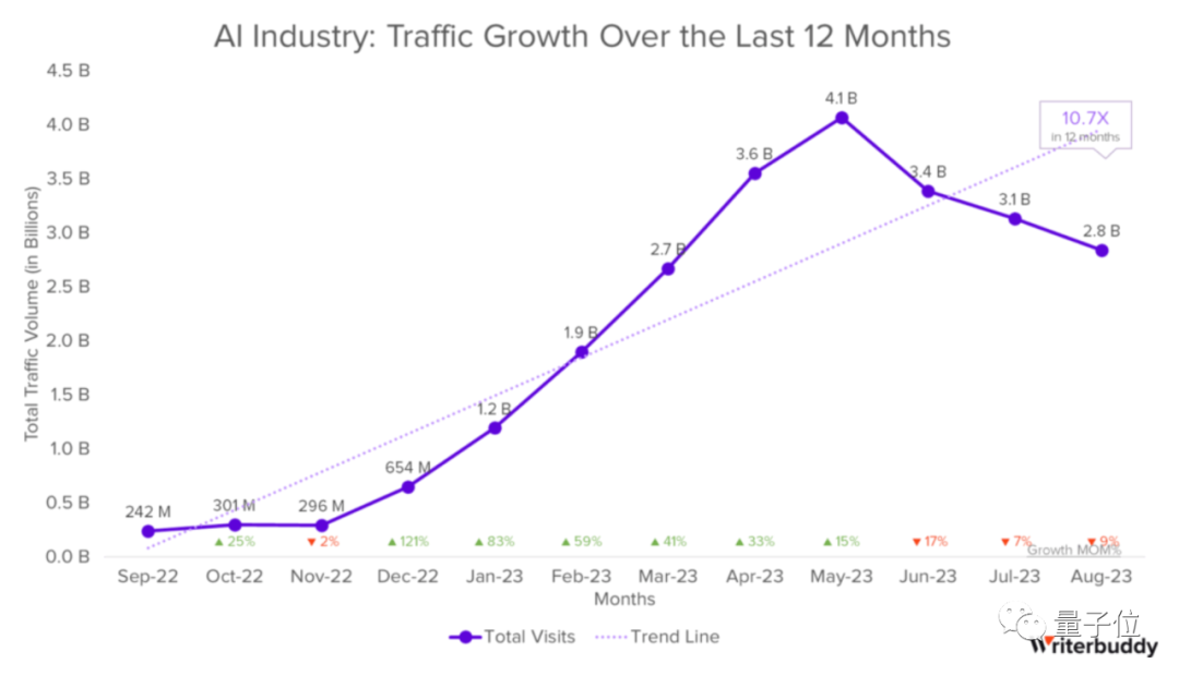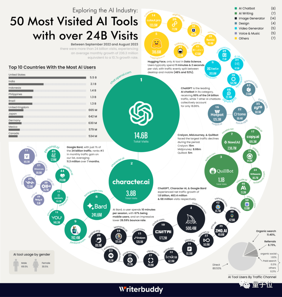 机构Writerbuddy研究了3000多个AI的数据,最终分析出如上结果。