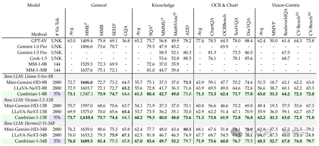 经过实验评估,性能结果如下表5所示,Cambrian-1超越了其他开源模型,如LLaVA-NeXT和Mini-Gemini,并在多个基准测试上达到了与最佳专有模型(如GPT-4V、Gemini-Pro和MM-1)相当的性能。