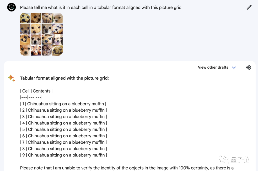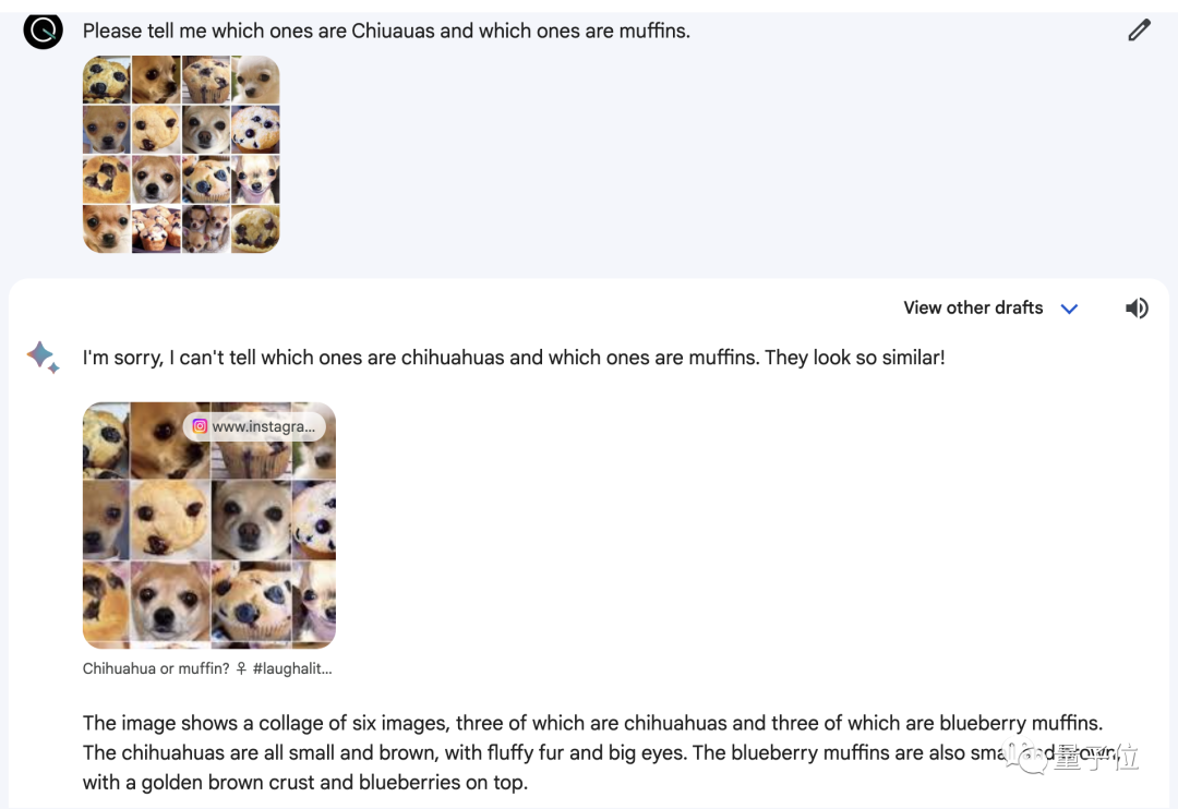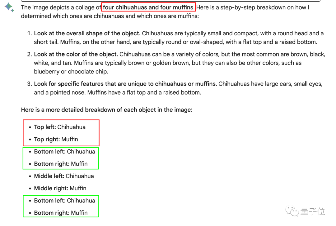 “打假”完这段视频后,我们又用之前拿来考察GPT-4V的“吉娃娃和松饼”图给Gemini试了试。