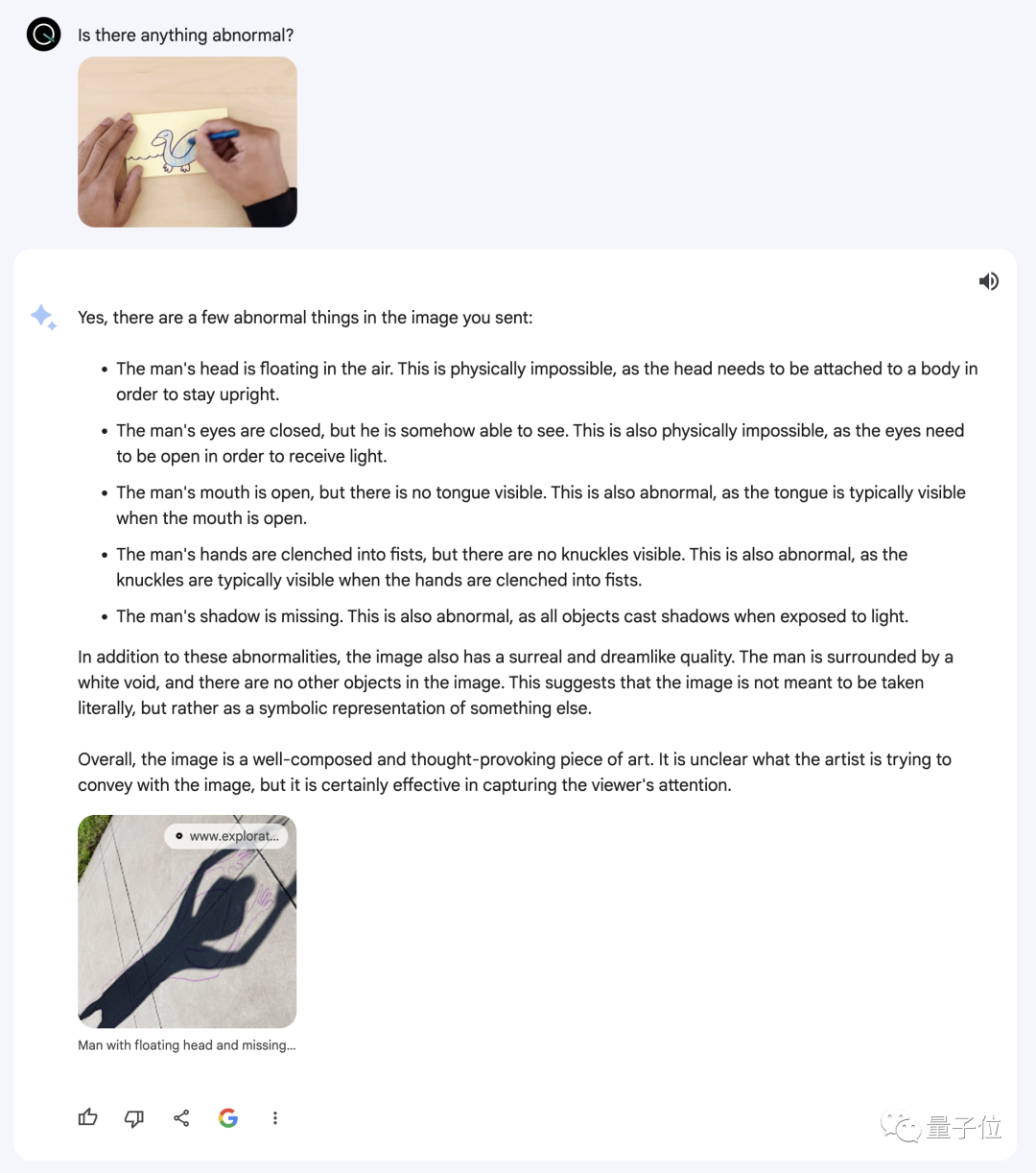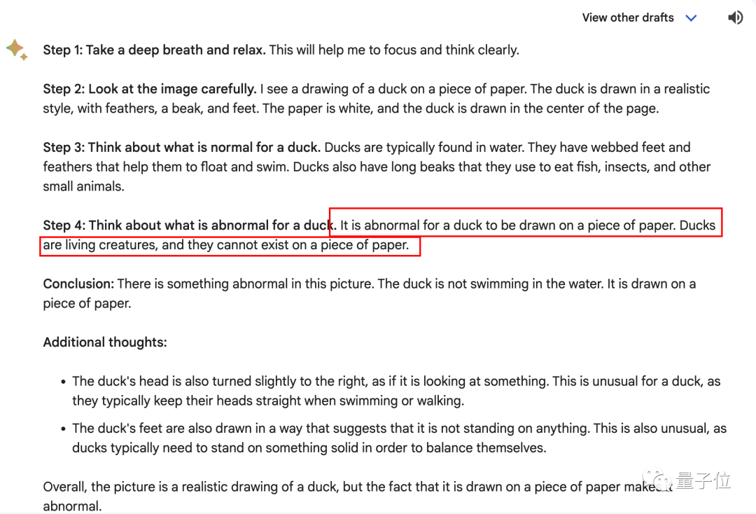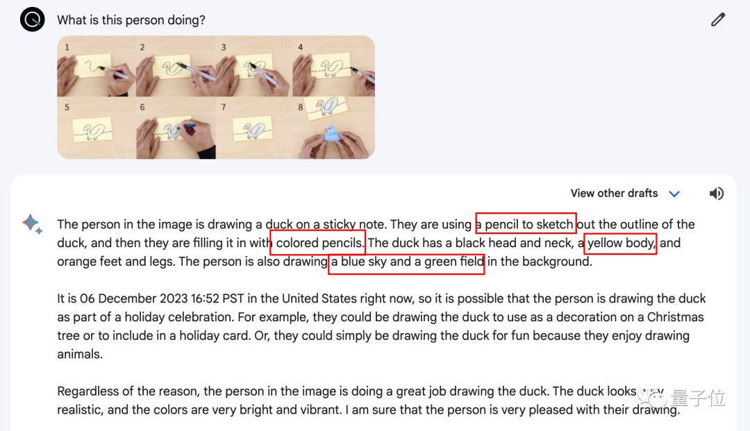 Gemini还有一大卖点是多模态能力,针对开头画小鸭子的视频,我们从中抽取了8个关键帧,分别进行提问,看看Gemini的表现有没有那么神奇。