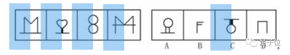 第一题的前四个符号是由1-4这四个数字与镜像后的结果拼接而成,所以下一个图应该是5与其镜像拼接,答案是C。(蓝色块是为了方便观察,传给Gemini的图中没有)