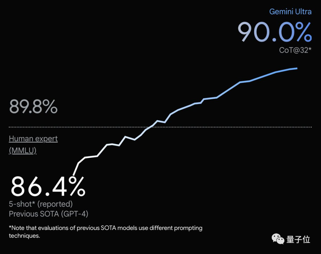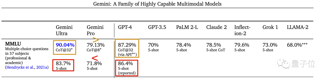 MMLU测试中,Gemini结果下面灰色小字标称CoT@32,展开来代表使用了思维链提示技巧、尝试了32次选最好结果。