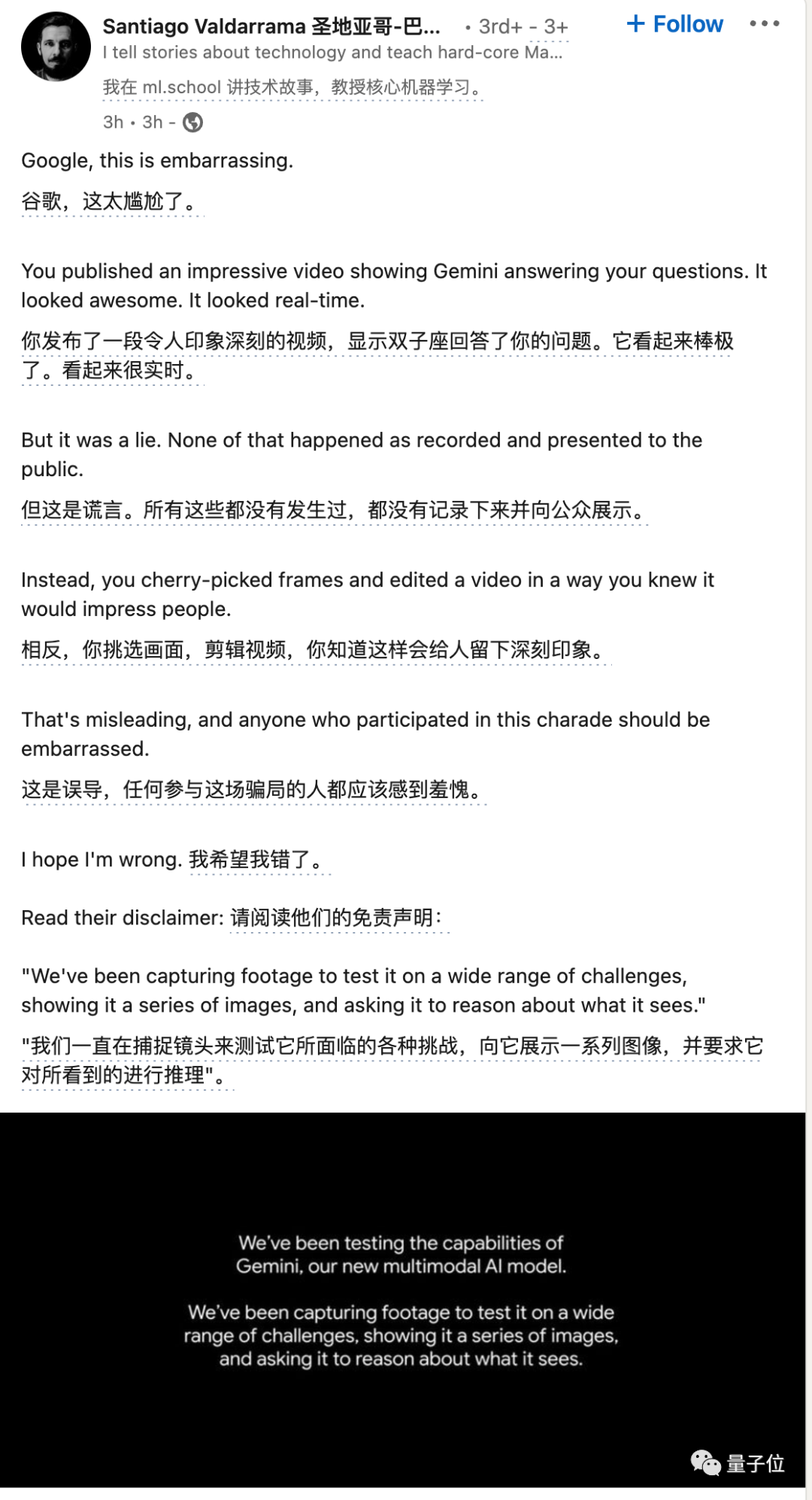 机器学习讲师Santiago Valdarrama认为声明可能暗示了展示的是精心挑选的好结果,而且不是实时录制而是剪辑的。