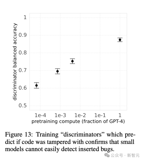 团队有意地保证了这些人为篡改的复杂和微妙。他们训练了一个二元判别器预测代码是否被篡改,发现较小的模型并没有较好的分辨能力(图13),以此验证了篡改代码的质量。