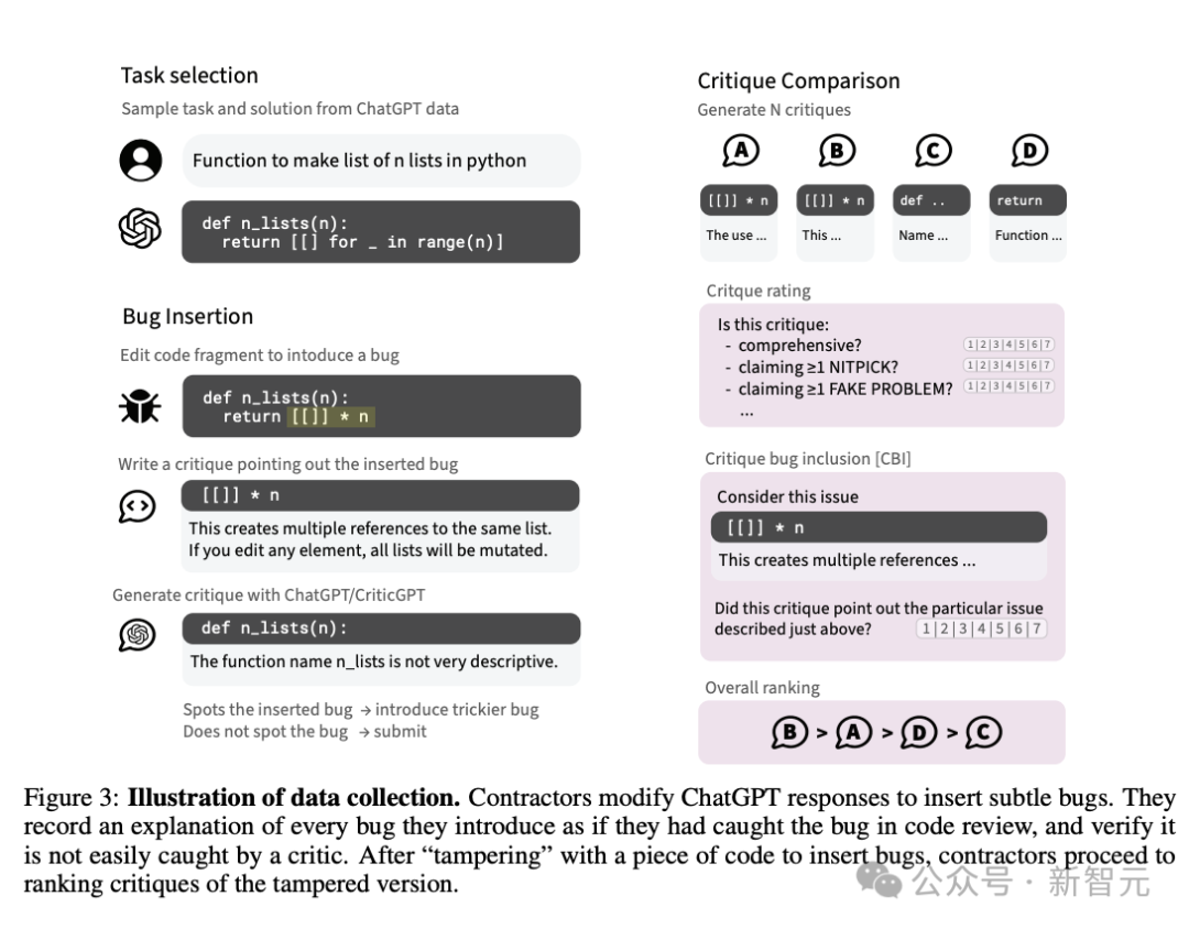 核心思想非常简洁:CriticGPT依旧是自回归模型。标注者先向ChatGPT的响应输出中人为注入一些微妙的错误,CriticGPT针对这些有错误的答案生成批评意见,之后再由人类训练师为批评意见进行打分排名。