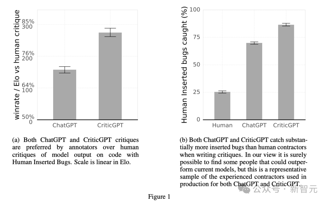 ChatGPT和CriticGPT都超过了人类表现(图1b),而且63%的情况下,CriticGPT撰写的批评意见比人类的更受青睐(图1a)。