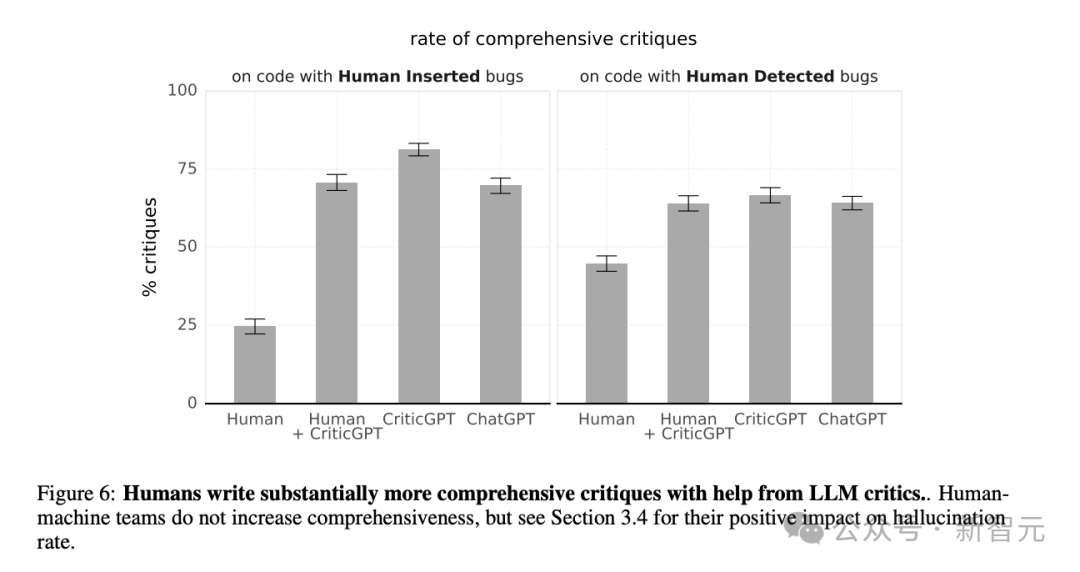 从图6中可以看到,CriticGPT的检测错误能力比较全面,对于人为篡改的错误以及原始输出中就存在的错误,都达到了最高的全面性百分比。