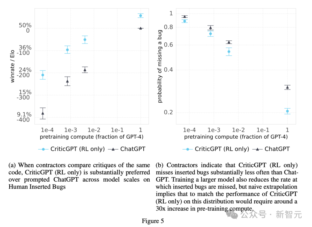 直观来看,要达到CriticGPT(只进行了RL)的同等水平,在没有额外数据或修改pipeline的情况下,需要将ChatGPT的预训练计算量扩大30×。