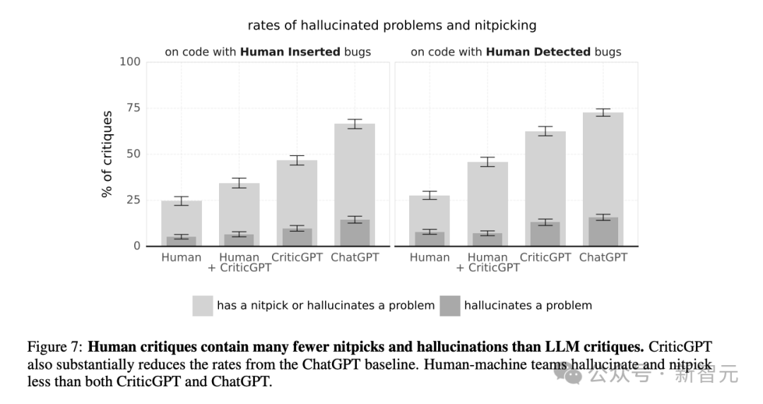 在产生幻觉这方面,ChatGPT的表现最不如人意,CriticGPT稍有提升。
