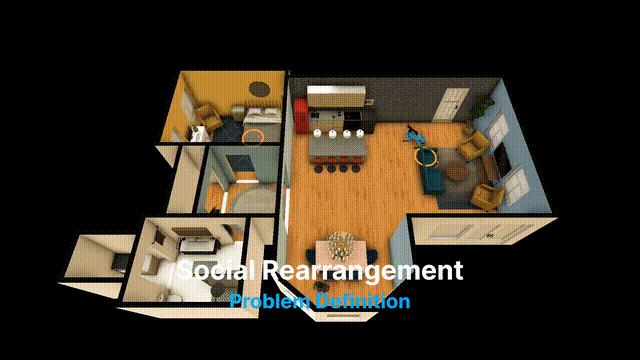 第一个任务是「社交整理」,涉及机器人和人形化身协同工作,执行一系列拾放任务,比如清理房屋。