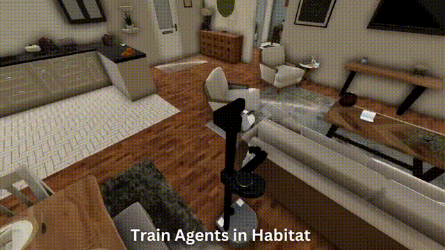 Habitat 2.0 引入了交互式环境(例如,可拿起的物品、可打开的抽屉),并训练虚拟机器人通过重新排列物品来清理房屋。
